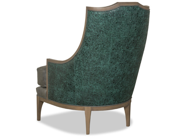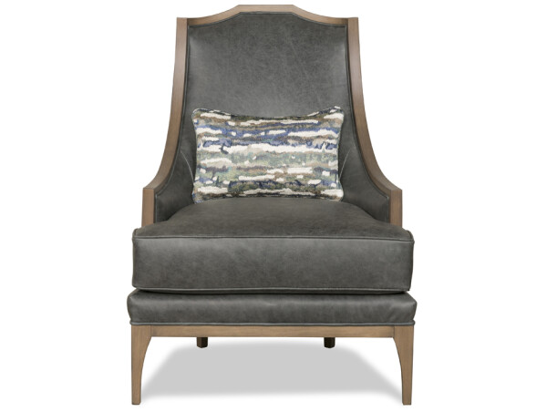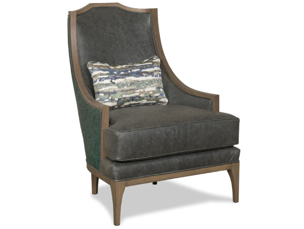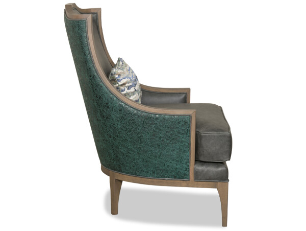 Stately and handsome, Grant is an updated classic. With a modernized empire style, sleek yet curvy, this chair is designed to be seen from any angle. Shown here with a smooth charcoal gray leather on the insides and cushion, Grant is paired with a texture-rich Monet Rain Forest embossed leather on the back. The soft textured fabric kidney pillow finishes the look.