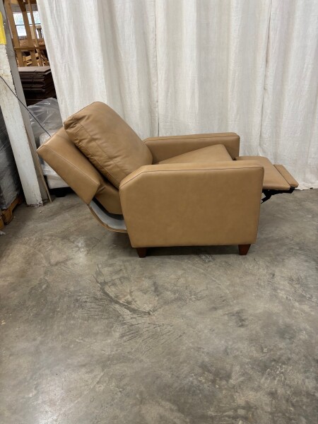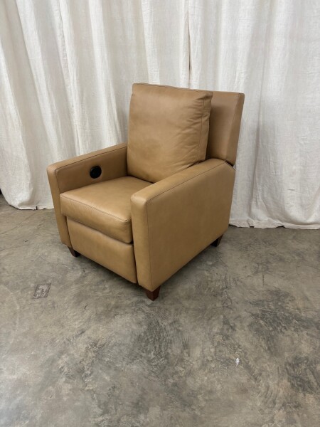 This Filmore recliner has comfortable medium-sized transitional styling and is available after being on a showroom sales floor for several years. The Renaldi Sand leather is a soft, but protected leather that is suitable for high traffic use. The power switch has a USB charging port within it. Priced "as is" and with no warranty. There is only one available. Fully operational but priced well beneath our wholesale cost because this specific mechanism has been shuttered and replaced with a different model.