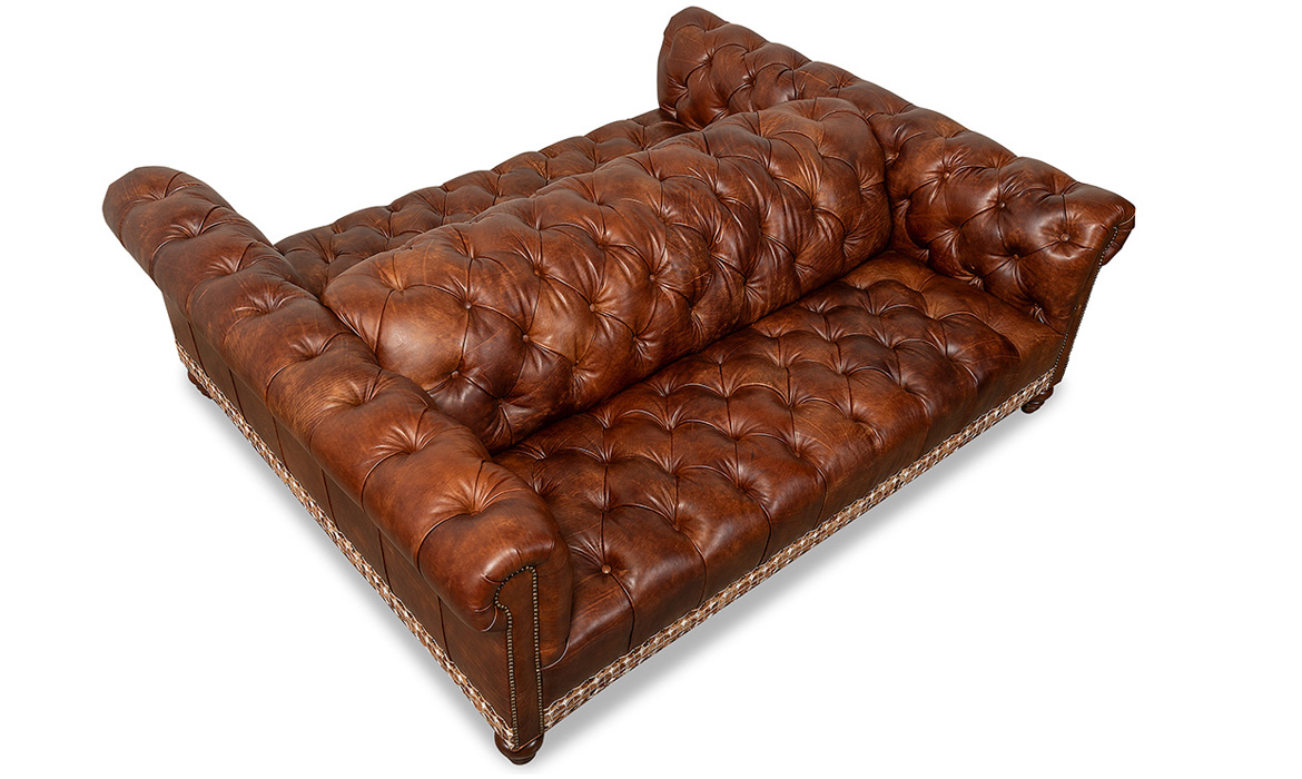 This spectacular statement piece, the double-sided Hotsy-Totsy, (1920s slang for “perfect”) features radiant, lush leather with deep all-over tufts, Chesterfield-style. The low-profile, low-slung design encourages your friends to lean in and chat—or lean back and de-stress. Detailing, like the addition of the specialty contrast trim on the gleaming leather, is just one example of the many creative options available at McKinley Leather.